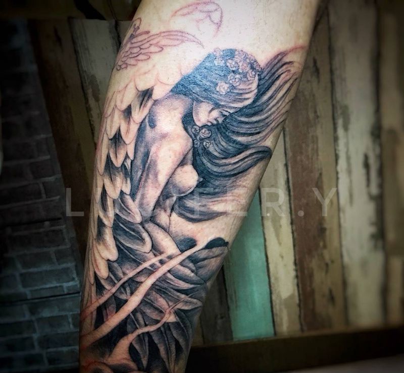 包小腿,天使恶魔纹身图片_成品腿部欧美人物鬼神纹身图案