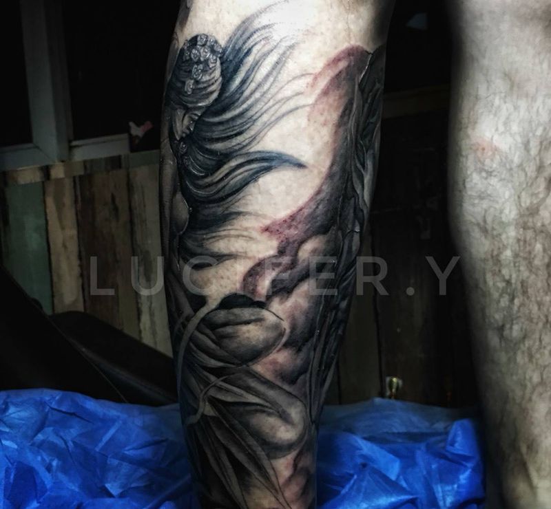 当前位置: 首页 >湖北省武汉市纹身店-炎刺青纹身图案>包小腿,天使恶魔纹身图片_成品腿部欧美人物鬼神纹身图案