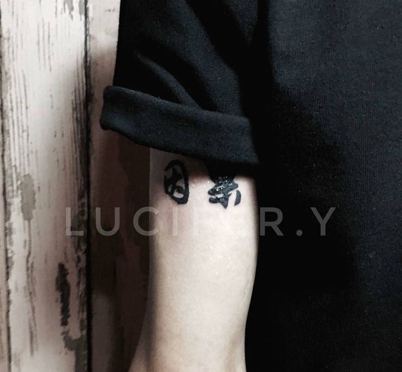 当前位置: 首页 >湖北省武汉市纹身店-炎刺青纹身图案>因果纹身图片_成品手臂传统字符纹身图案