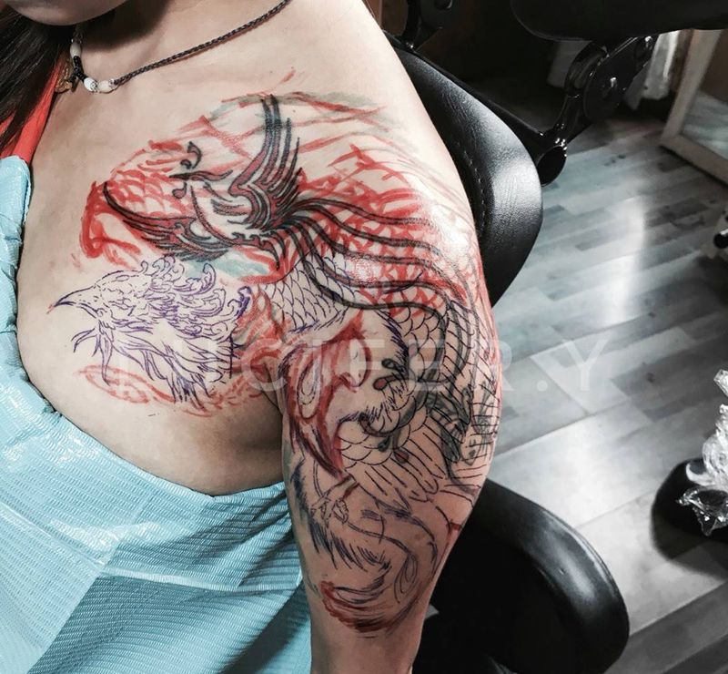 凤凰小半甲遮盖纹身图片_成品肩部手臂传统动物纹身图案