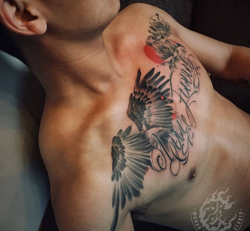鹰花胸纹身图片_胸部欧美写实花体字纹身图案