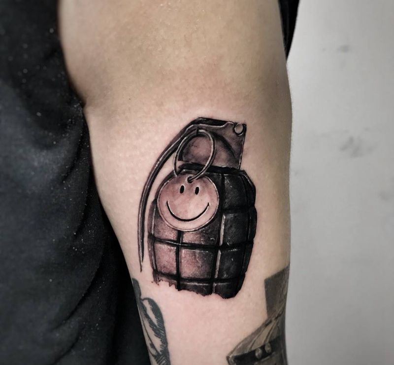 当前位置: 首页 >湖北省武汉市纹身店-纹艺刺刻纹身馆纹身图案>微笑面对纹身图片_手臂手部欧美写实手雷微笑纹身图案