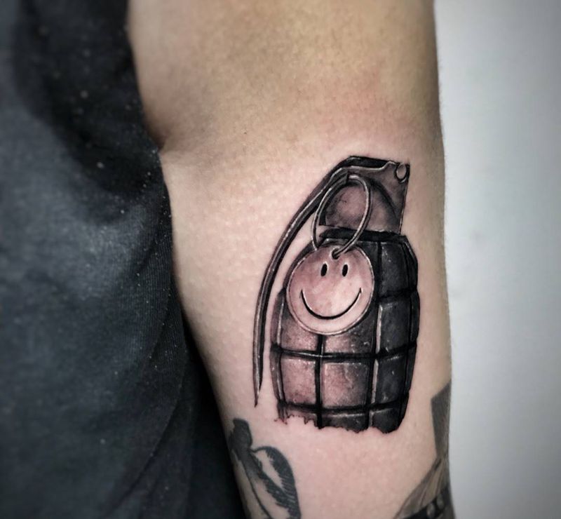 当前位置: 首页 >湖北省武汉市纹身店-纹艺刺刻纹身馆纹身图案>微笑面对纹身图片_手臂手部欧美写实手雷微笑纹身图案