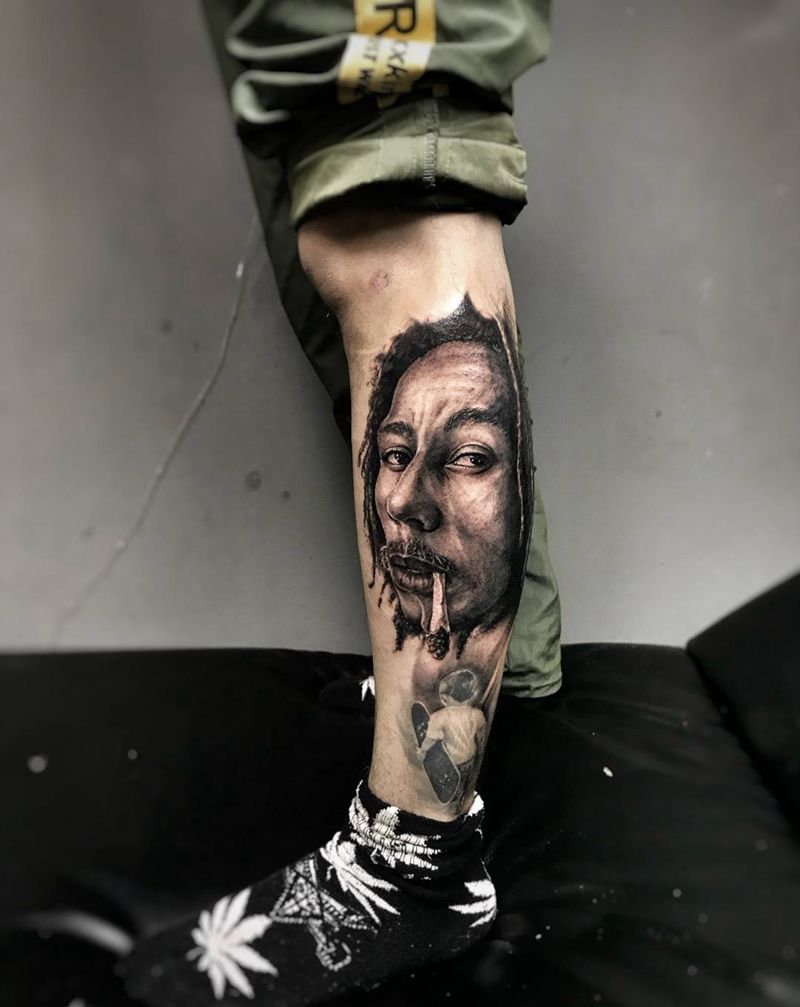 鲍勃马利纹身图片_腿部脚部欧美写实肖像纹身图案