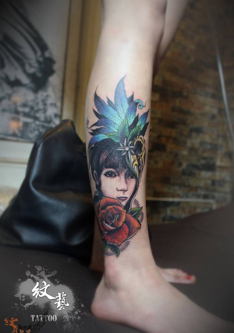 • T包小腿吹火男+阿多福纹身图片_腿部老传统新传统吹火男阿