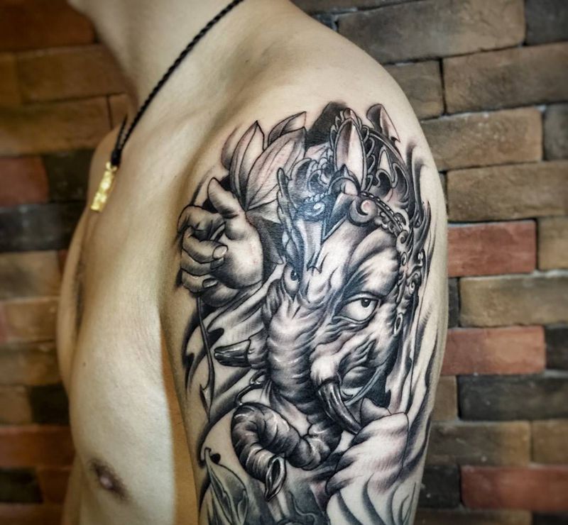当前位置: 首页 >湖北省武汉市纹身店-纹艺刺刻纹身馆纹身图案>传统象神纹身图片_成品手臂传统纹身图案