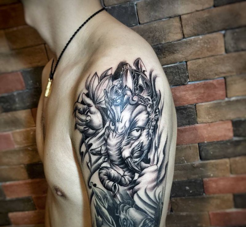 当前位置: 首页 >湖北省武汉市纹身店-纹艺刺刻纹身馆纹身图案>传统象神纹身图片_成品手臂传统纹身图案