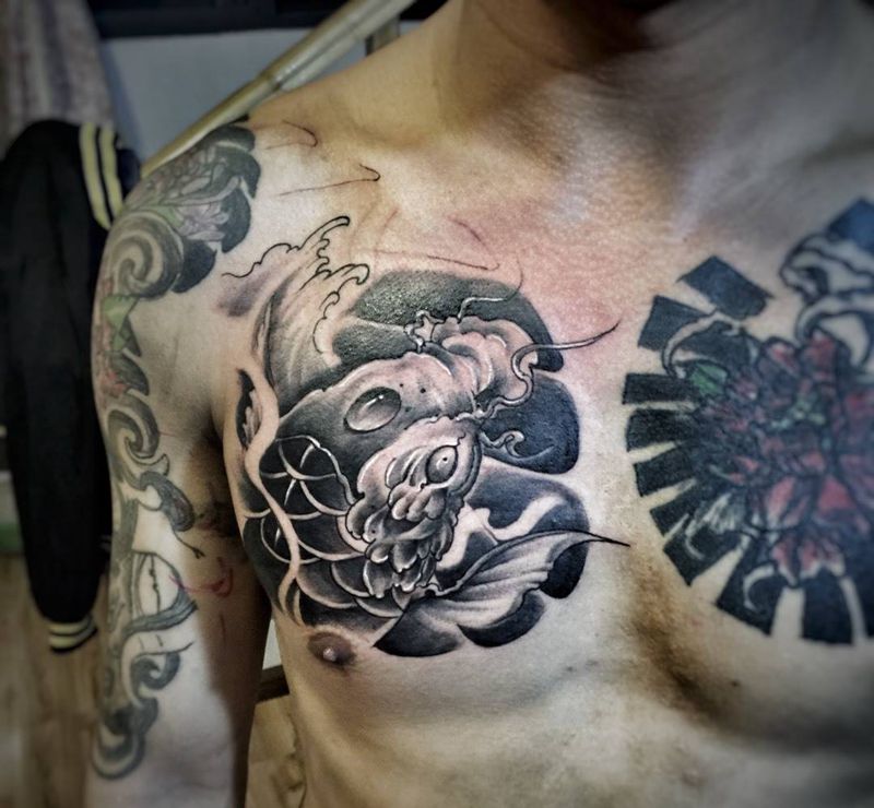 当前位置: 首页 >湖北省武汉市纹身店-纹艺刺刻纹身馆纹身图案>新传统鲤鱼纹身图片_成品胸部传统动物纹身图案
