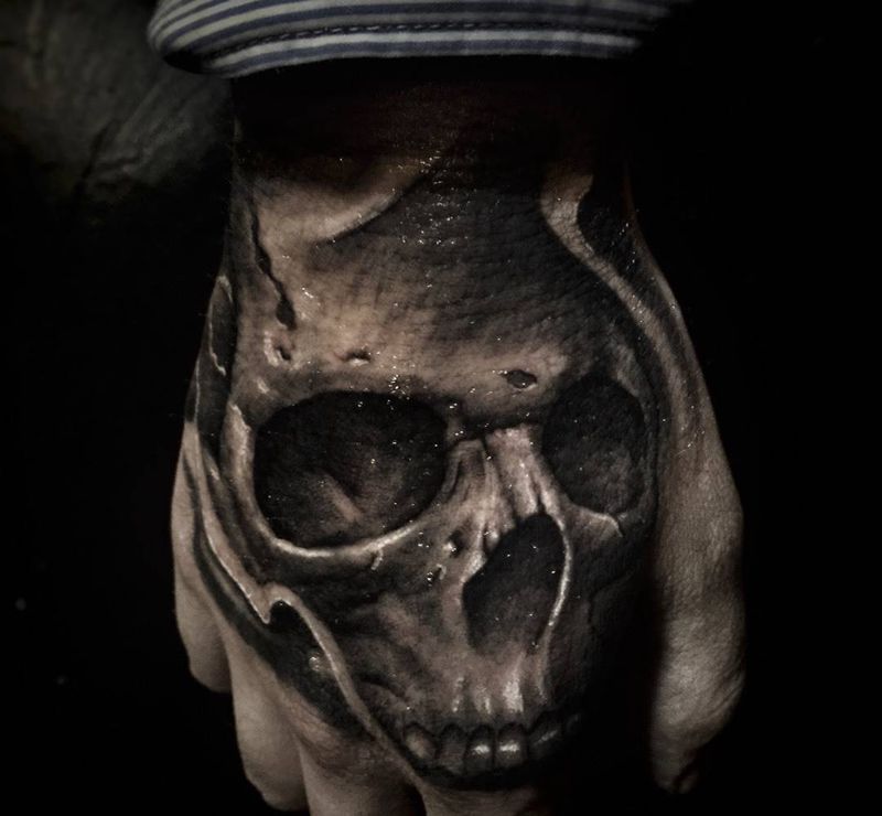 手绘掌面骷髅…纹身图片_成品手部鬼神纹身图案