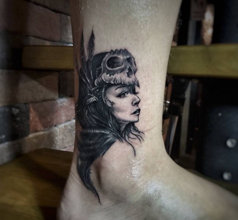 印第安女战士遮盖小羽毛纹身图片_成品腿部脚部欧美肖像写实人物宗教原创纹身图案