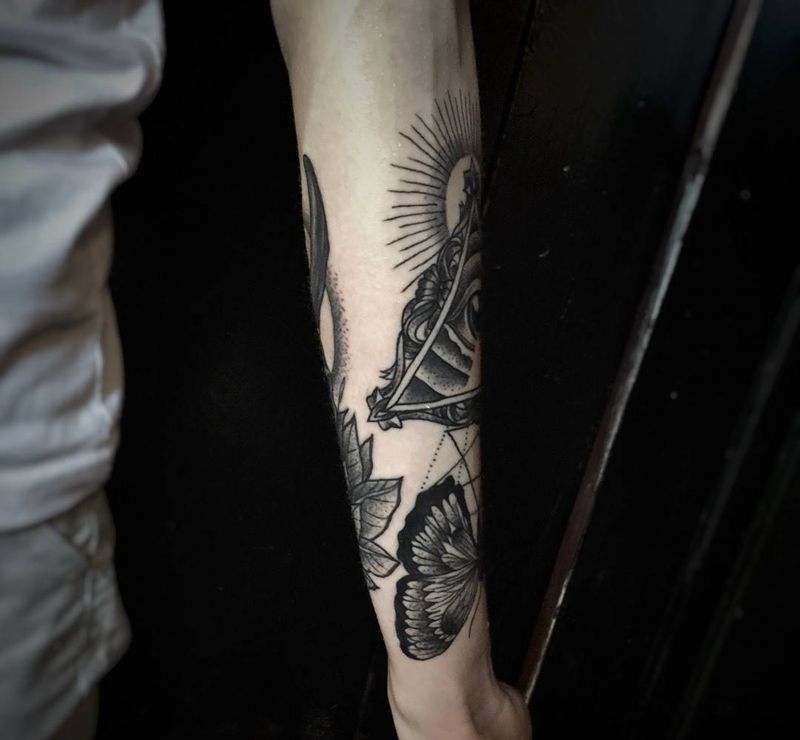 点刺包小臂纹身图片_成品手臂欧美清新鬼神几何纹身图案