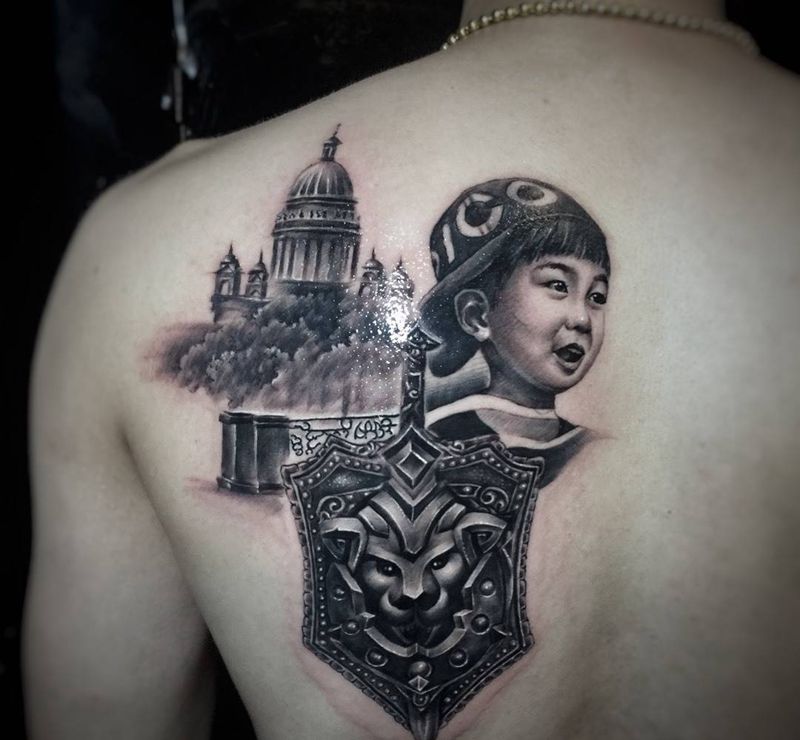 当前位置: 首页 >湖北省武汉市纹身店-纹艺刺刻纹身馆纹身图案>守护纹身图片_成品背部欧美肖像写实人物原创纹身图案