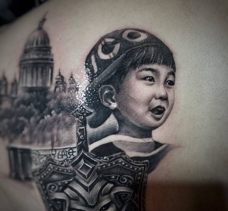 当前位置: 首页 >湖北省武汉市纹身店-纹艺刺刻纹身馆纹身图案>守护纹身图片_成品背部欧美肖像写实人物原创纹身图案