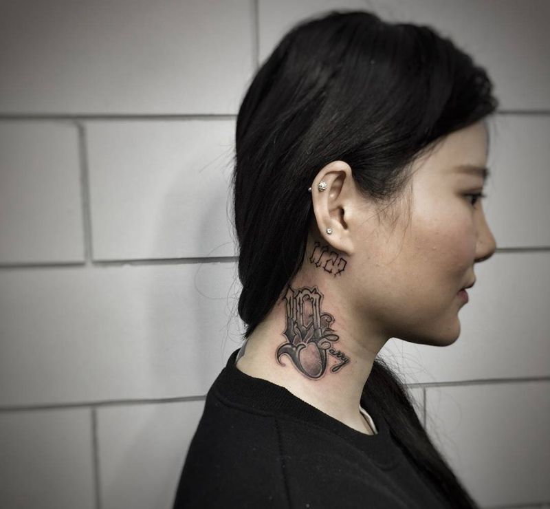 脖子小花体修改纹身图片_成品肩部颈部欧美几何字符纹身图案
