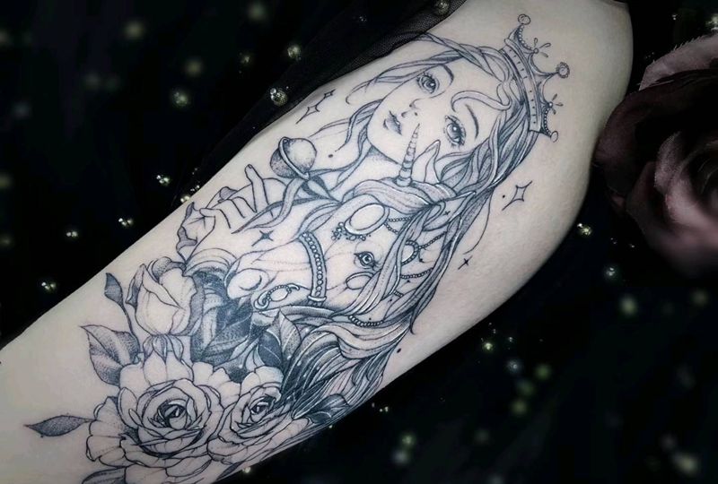 当前位置: 首页 >湖北省武汉市纹身店-KOKO TATTOO原创定制纹身店纹身图案>少女独角兽纹身图片_手臂点刺遮盖独角兽公主纹身图案
