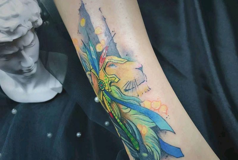 当前位置: 首页 >湖北省武汉市纹身店-KOKO TATTOO原创定制纹身店纹身图案>狮子座纹身图片_腿部水彩狮子水彩星座纹身图案