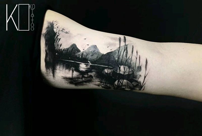 当前位置: 首页 >湖北省武汉市纹身店-KOKO TATTOO原创定制纹身店纹身图案>漓江夜景纹身图片_手臂水墨点刺漓江水墨山水纹身图案