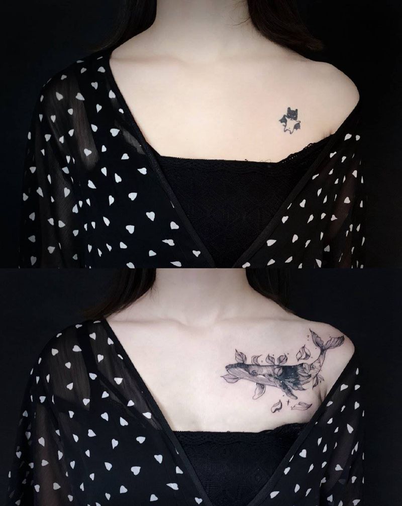 当前位置: 首页 >湖北省武汉市纹身店-KOKO TATTOO原创定制纹身店纹身图案>鲸鱼纹身图片_肩部点刺鲸鱼花卉遮盖纹身图案