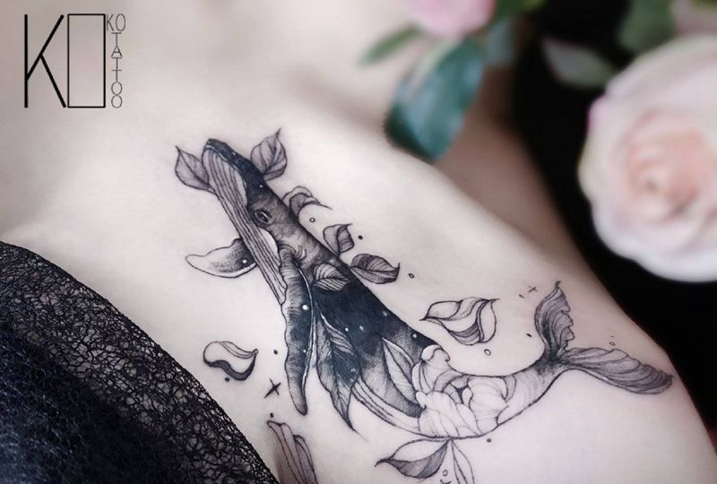 当前位置: 首页 >湖北省武汉市纹身店-KOKO TATTOO原创定制纹身店纹身图案>鲸鱼纹身图片_肩部点刺鲸鱼花卉遮盖纹身图案