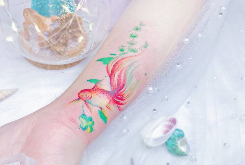 当前位置: 首页 >湖北省武汉市纹身店-KOKO TATTOO原创定制纹身店纹身图案>金鱼纹身图片_手臂水彩金鱼四叶草水彩纹身图案