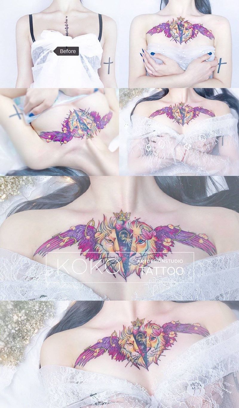 当前位置: 首页 >湖北省武汉市纹身店-KOKO TATTOO原创定制纹身店纹身图案>狮子花胸——遮盖纹身图片_胸部水彩星空狮子翅膀纹身图案