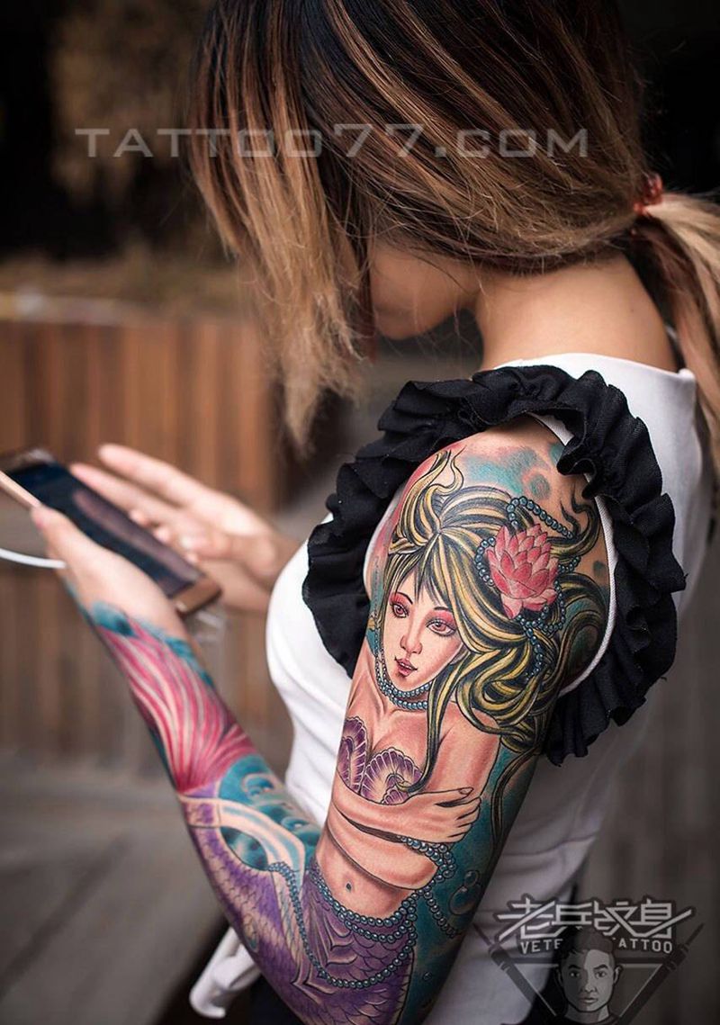 花臂美人鱼纹身作品纹身图片_成品手臂欧美人物肖像纹身图案