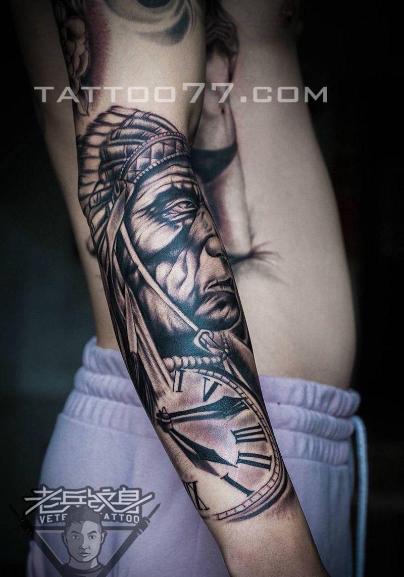 当前位置: 首页 >湖北省武汉市纹身店-武汉老兵纹身店纹身图案>花臂印第安人纹身作品纹身图片_成品手臂肖像欧美人物纹身图案
