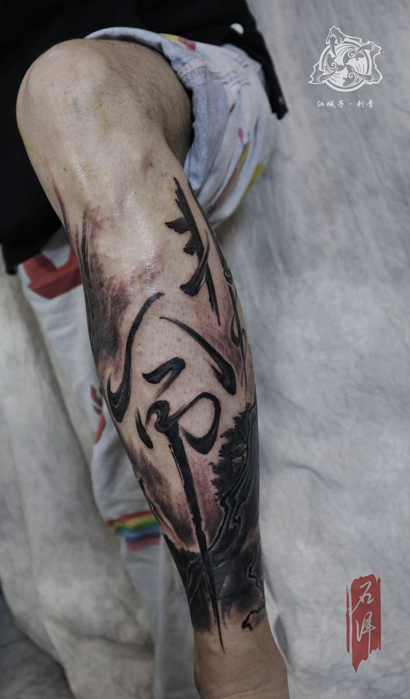 当前位置: 首页 >湖北省武汉市纹身店-武汉江城子刺青纹身图案>遮盖『非命』纹身图片_腿部水墨中国风长城书法纹身图案