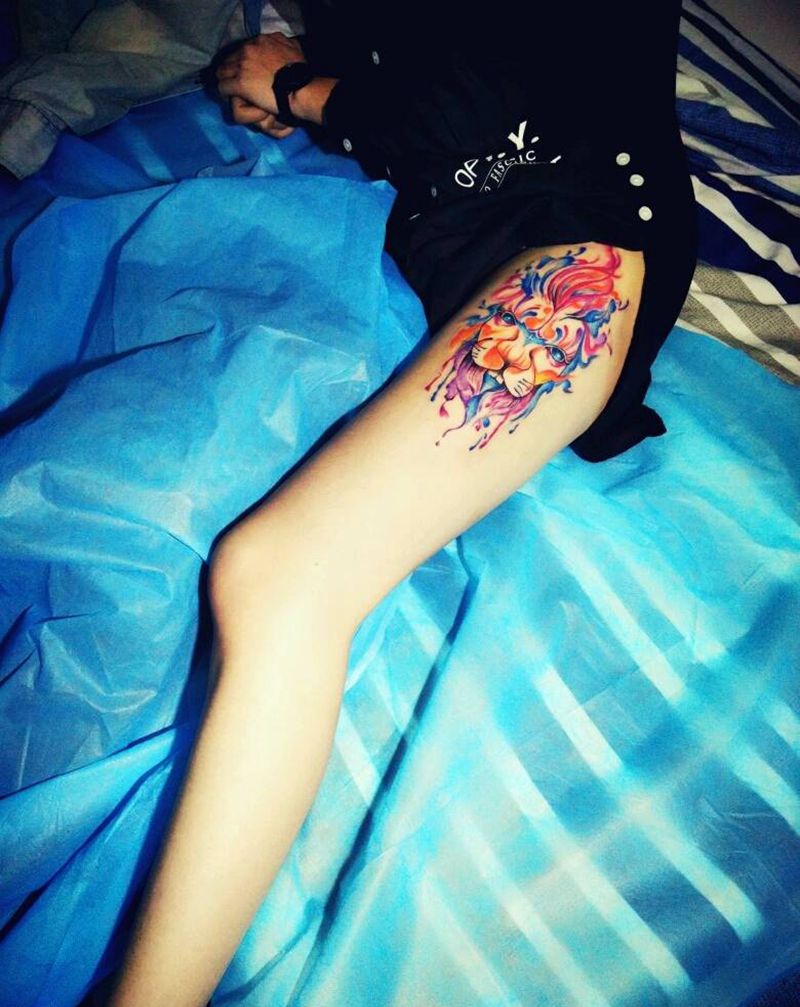 原创水彩狮子纹身图片_腿部清新动物水彩成品纹身图案