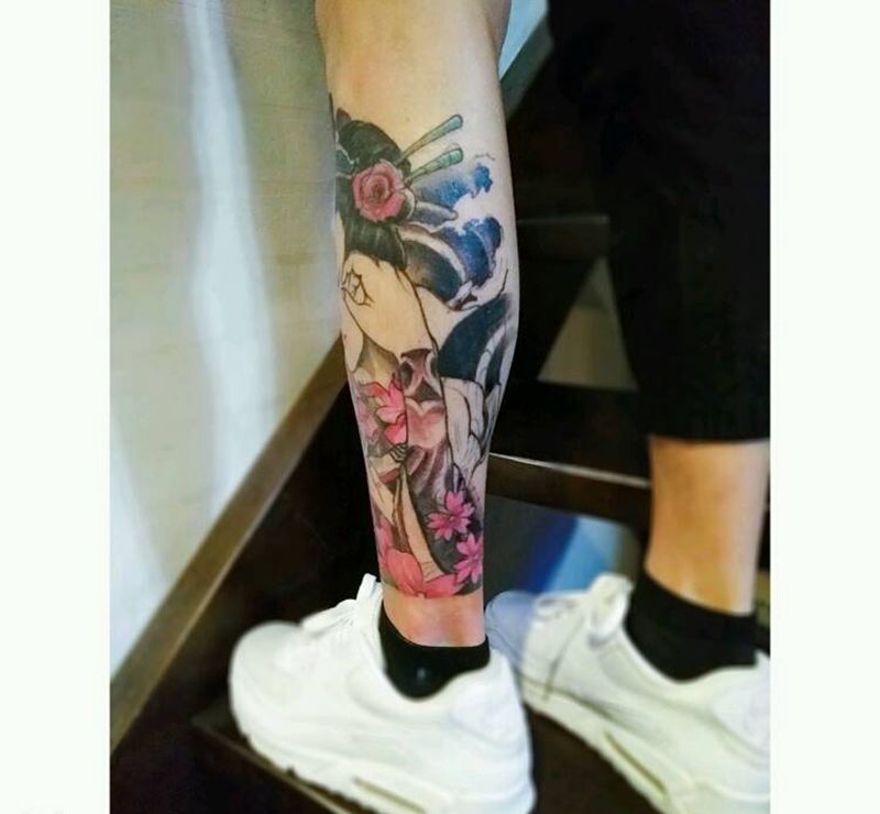 当前位置: 首页 >湖北省武汉市纹身店-武汉江城子刺青纹身图案>小腿艺妓遮盖纹身图片_腿部传统国画人物原创中国风成品纹身图案
