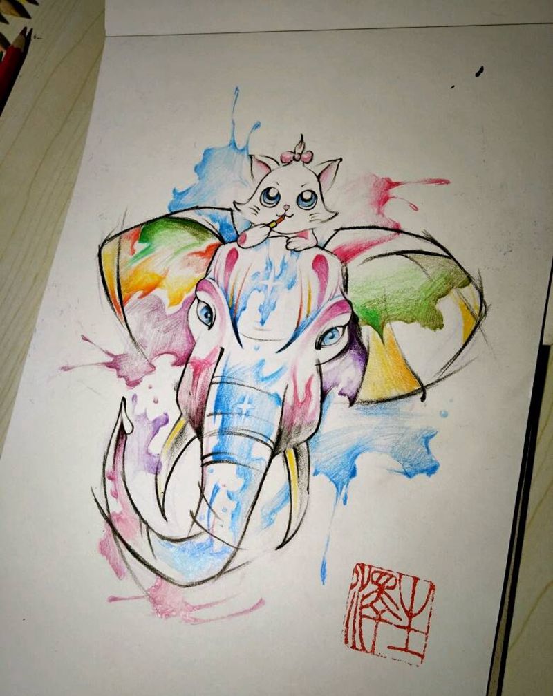 水彩大象纹身图片_手臂清新动物原创水彩手稿纹身图案