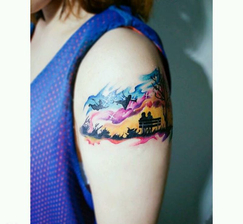 当前位置: 首页 >湖北省武汉市纹身店-武汉江城子刺青纹身图案>水彩风景纹身图片_手臂清新人物原创水彩成品纹身图案