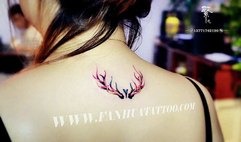 当前位置: 首页 >湖北省武汉市纹身店-武汉江城子刺青纹身图案>鹿角纹身图片_背部清新水彩成品纹身图案