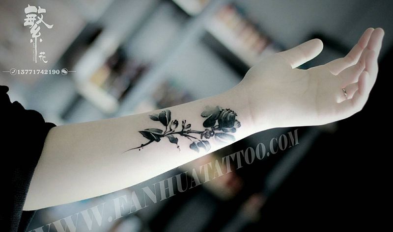 当前位置: 首页 >湖北省武汉市纹身店-武汉江城子刺青纹身图案>遮盖·水墨花纹身图片_手臂国画植物泼墨中国风成品纹身图案