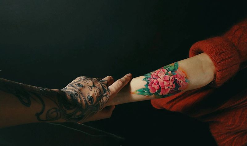 当前位置: 首页 >湖北省武汉市纹身店-武汉江城子刺青纹身图案>水彩·绣球花纹身图片_手臂清新植物原创水彩成品纹身图案