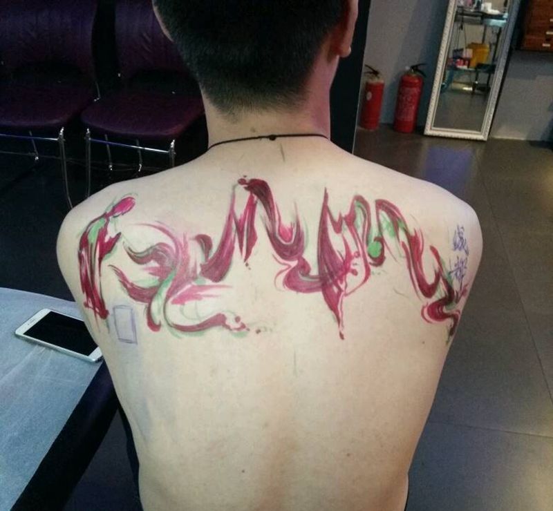 当前位置: 首页 >湖北省武汉市纹身店-武汉江城子刺青纹身图案>川藏线纹身图片_背部国画字符原创泼墨中国风书法成品纹身图案