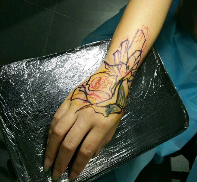 • 手背潮流时尚的玫瑰花眼睛纹身图案