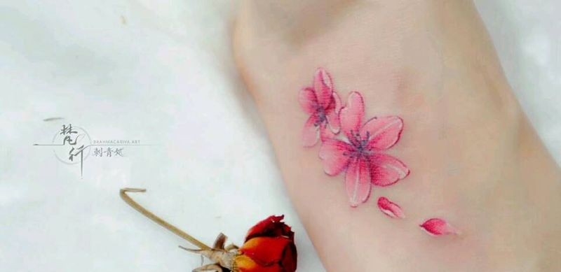 樱花纹身图片_脚部新传统水彩樱花纹身图案