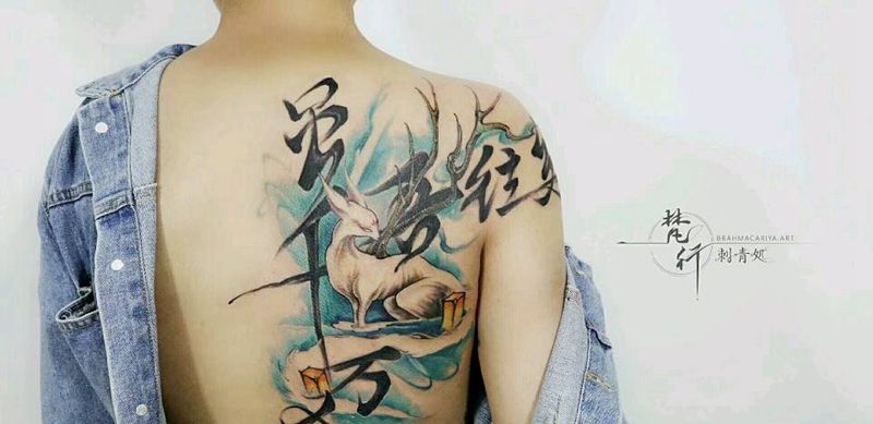 当前位置: 首页 >湖北省武汉市纹身店-武汉江城子刺青纹身图案>书法纹身图片_背部新传统水彩书法狐狸纹身图案