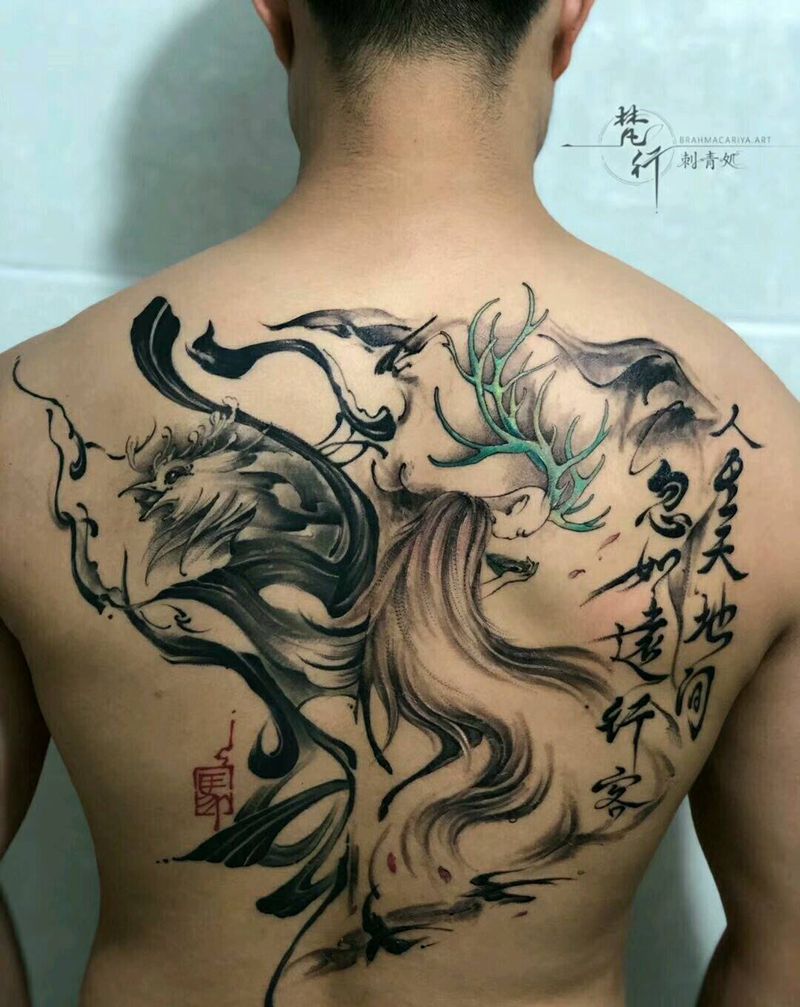 半背添加纹身图片_背部新传统水墨书法纹身图案