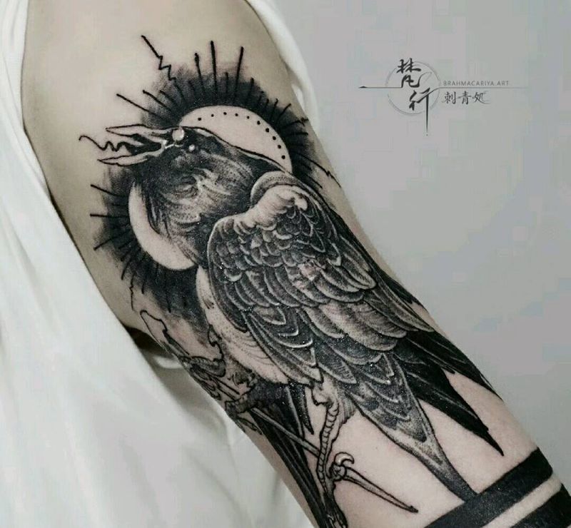 当前位置: 首页 >湖北省武汉市纹身店-武汉江城子刺青纹身图案>三足金乌纹身图片_手臂老传统三足金乌臂环圆纹身图案
