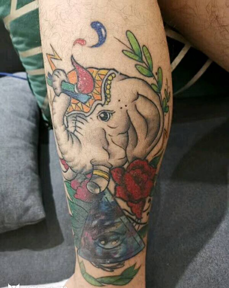 当前位置: 首页 >湖北省武汉市纹身店-武汉江城子刺青纹身图案>修改添加纹身图片_腿部新传统水彩象神眼睛纹身图案