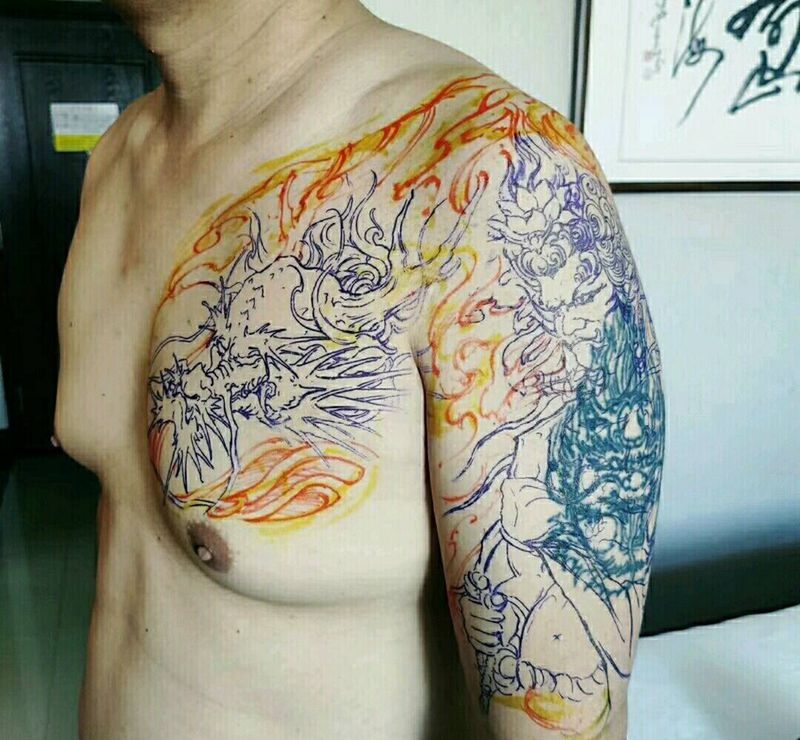 当前位置: 首页 >湖北省武汉市纹身店-武汉江城子刺青纹身图案>遮盖添加纹身图片_胸部手臂新传统水彩不动明王纹身图案