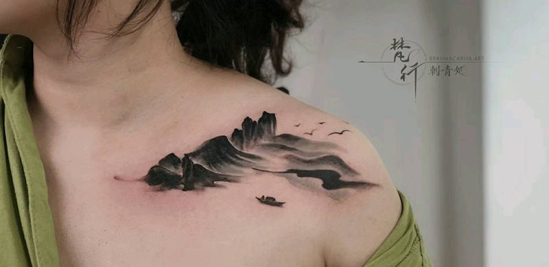 山水遮盖纹身图片_胸部新传统水墨山水纹身图案
