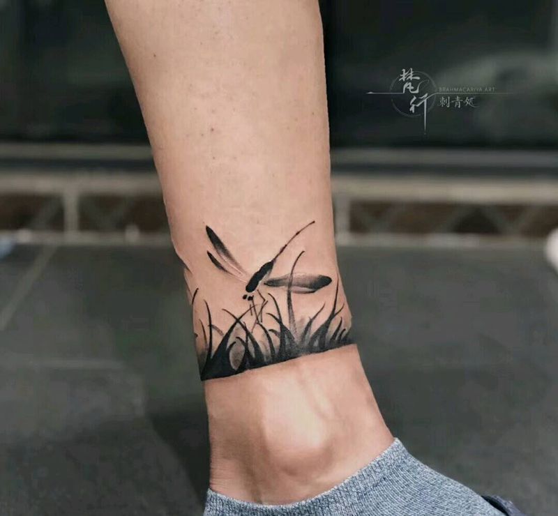 蜻蜓纹身图片_腿部新传统水墨蜻蜓小草纹身图案