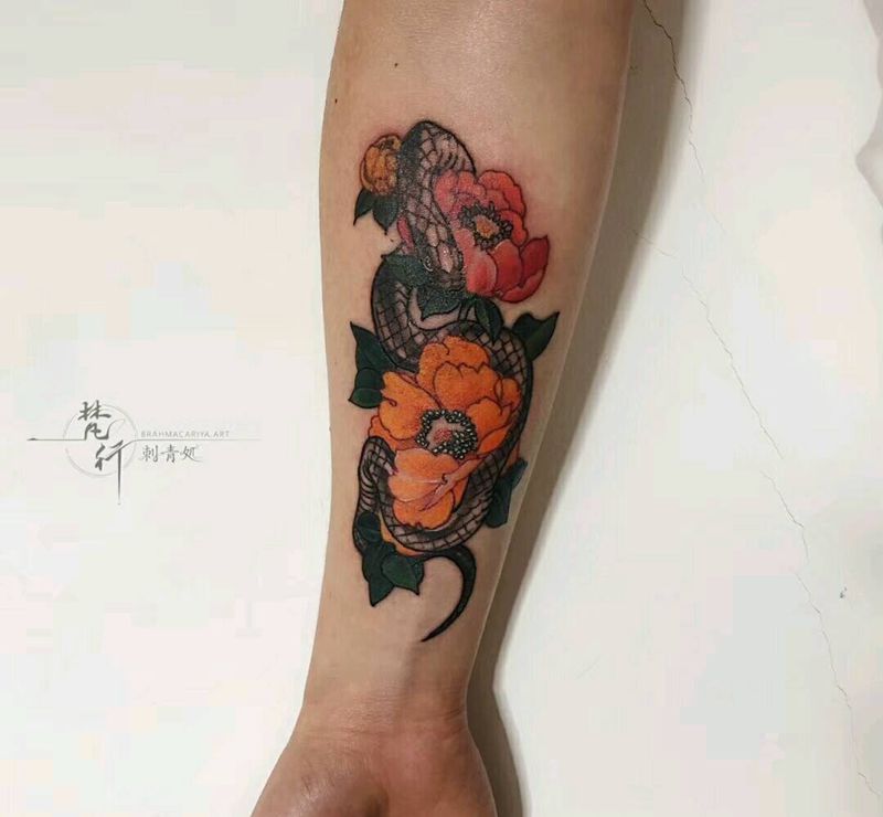 当前位置: 首页 >湖北省武汉市纹身店-武汉江城子刺青纹身图案>蛇恋花纹身图片_腿部老传统蛇花纹身图案