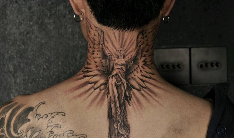 颈部天使纹身图片_颈部欧美写实纹身图案
