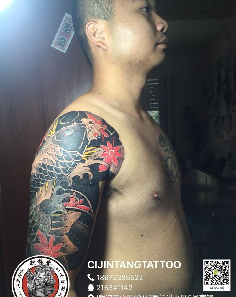 当前位置: 首页 >湖北省武汉市纹身店-刺锦堂纹身纹身图案>浮世绘 鲤鱼半胛 遮盖老鹰纹身图片