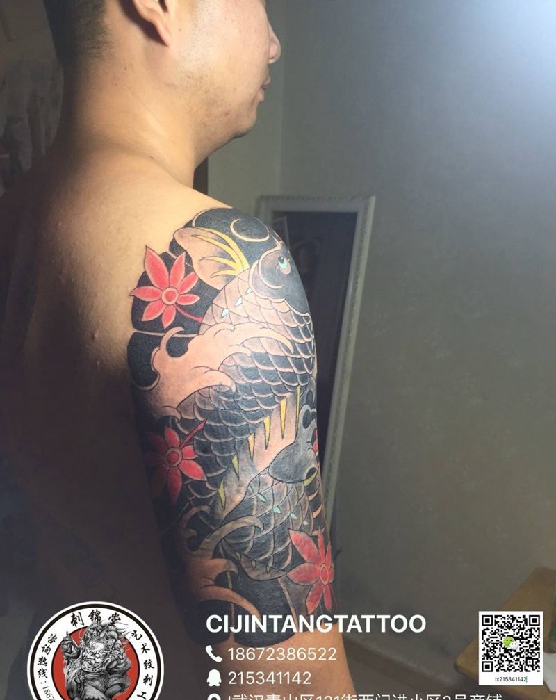 当前位置: 首页 >湖北省武汉市纹身店-刺锦堂纹身纹身图案>浮世绘 鲤鱼半胛 遮盖老鹰纹身图片