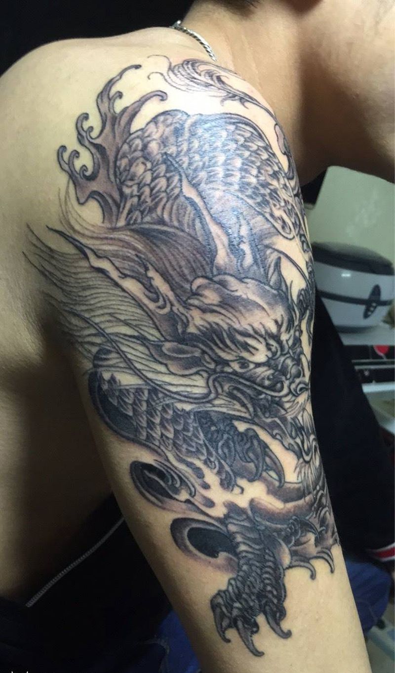 • T网红王老大花腿龙纹身图片_腿部新传统纹身图案